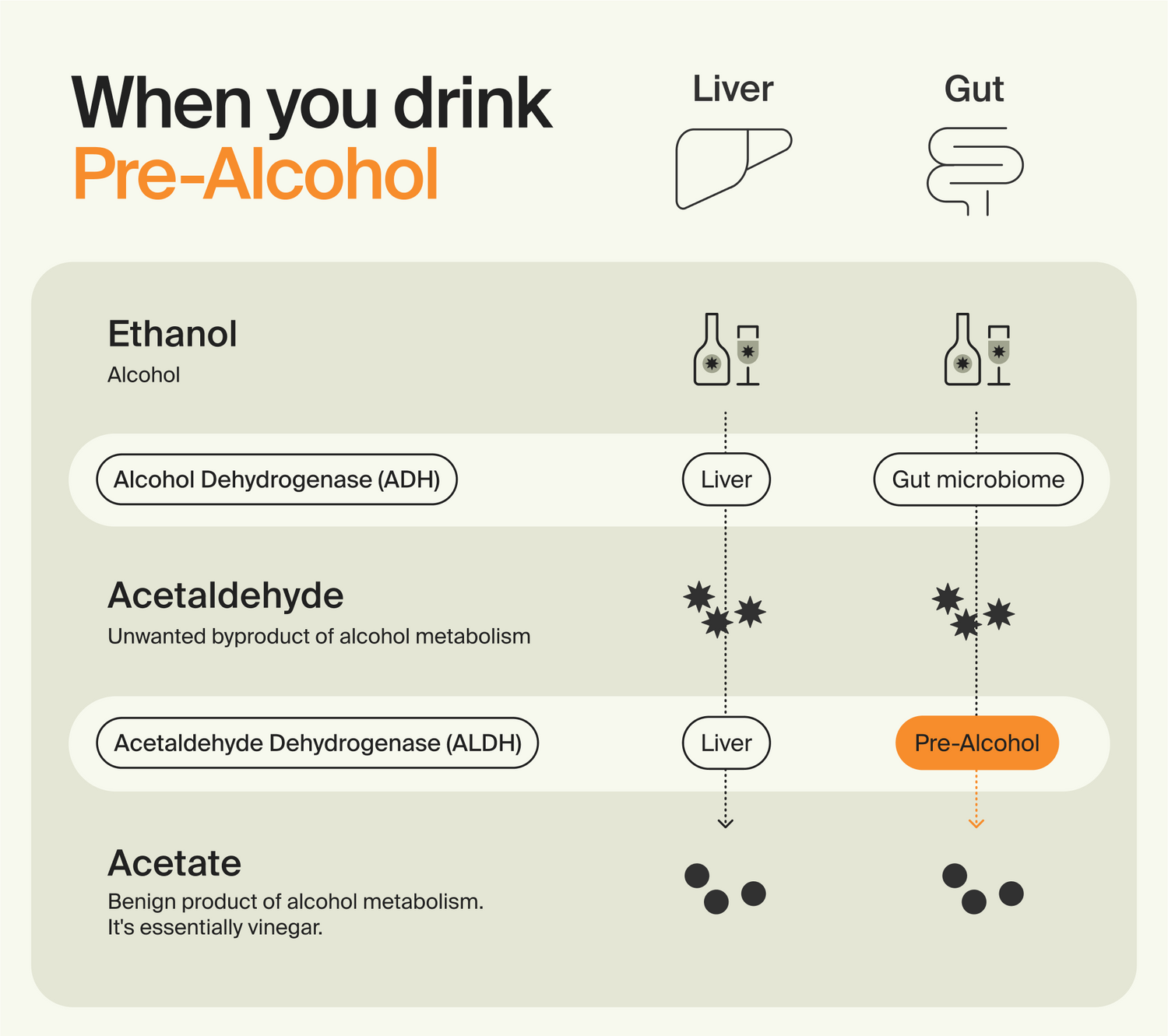 Pre-Alcohol helps our gut catch up by temporarily adding a probiotic that can break down acetaldehyde.
