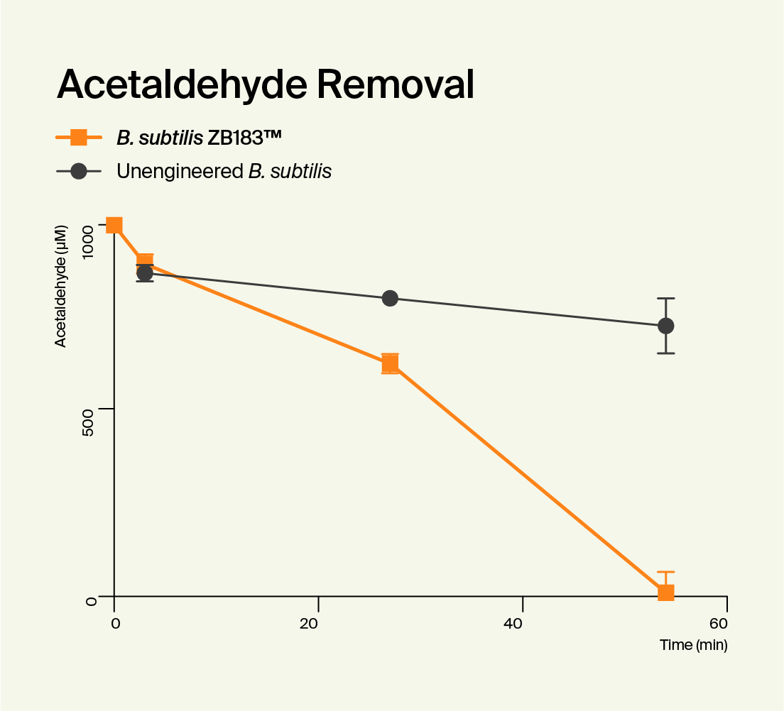To confirm that ZB183™ worked as intended, we tested its ability to make ALDH and break down acetaldehyde. Over a series of laboratory tests where we compared it to the unedited B. subtilis strain, we confirmed that our Pre-Alcohol Probiotic was highly effective at producing ALDH. We also confirmed that while the control strain broke down almost no acetaldehyde, ZB183™ was able to break down more acetaldehyde than you could ever encounter when drinking. We published a paper containing the data from these tests, and it can be found in the peer-reviewed PLOS One journal..